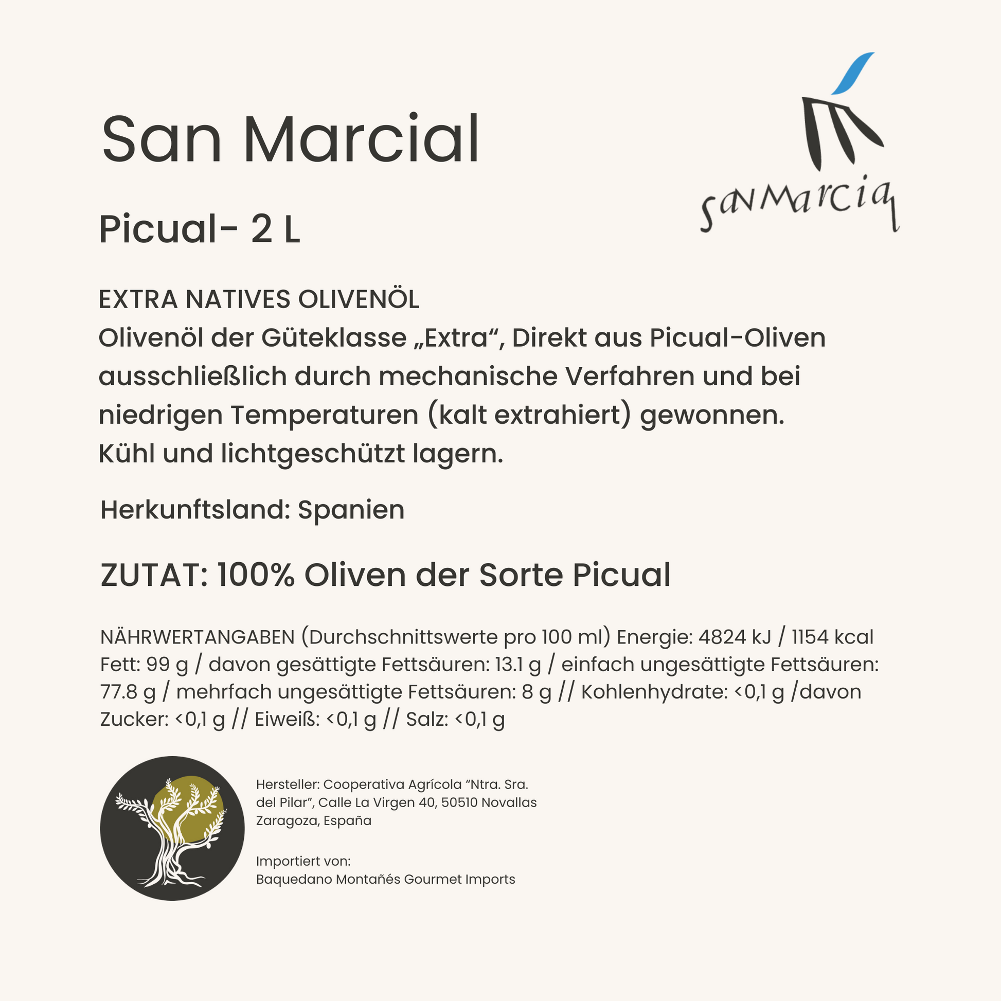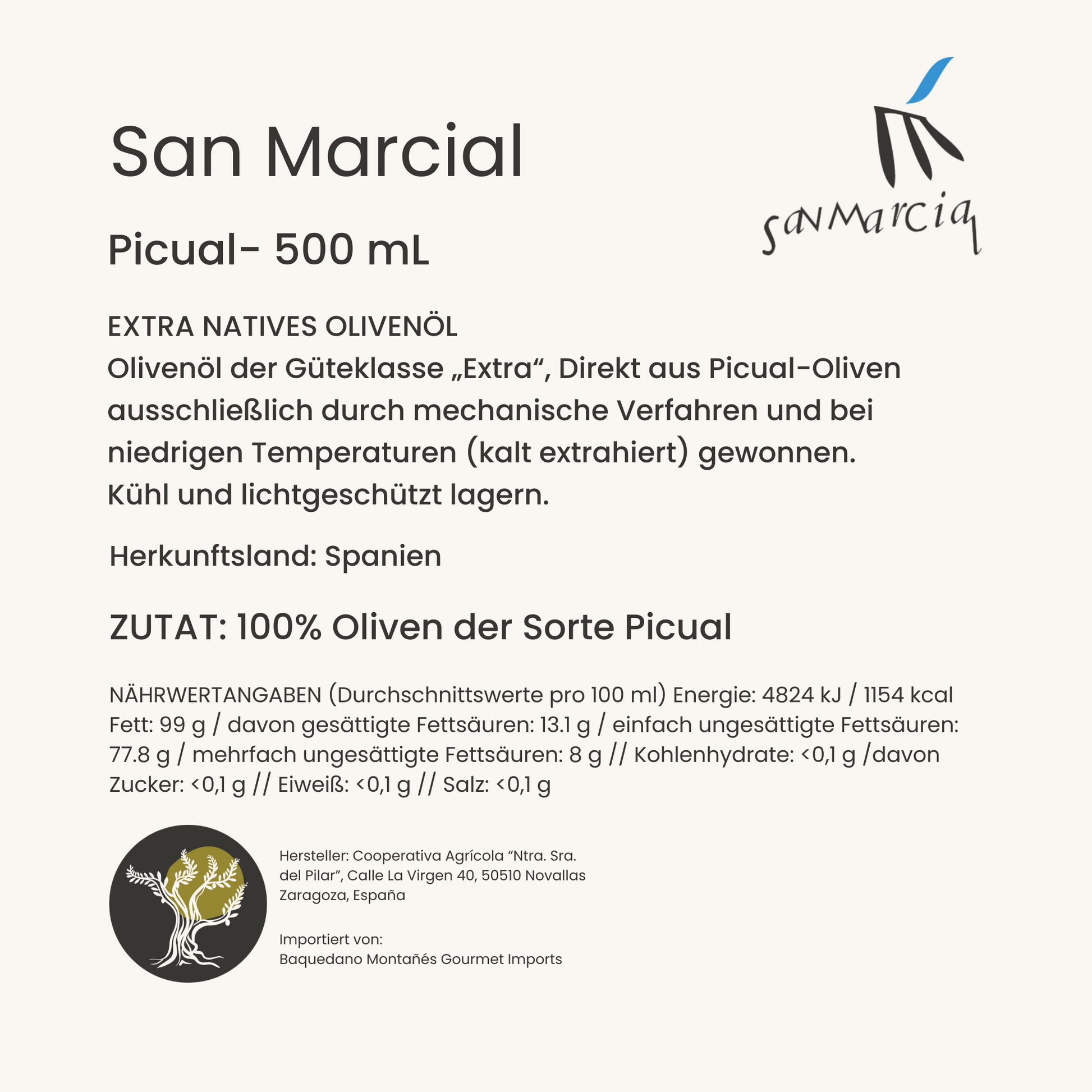 San Marcial Picual wird aus 100 % Picual-Oliven gewonnen und innerhalb von 24 Stunden nach der Ernte kaltgepresst, um seine intensiven Aromen und wertvollen Antioxidantien zu bewahren. Mit kräftigen Noten von grüner Tomate, Olivenblatt und Artischocke bietet es ein ausgewogenes Geschmacksprofil mit einer angenehmen Bitterkeit und pfeffriger Schärfe.